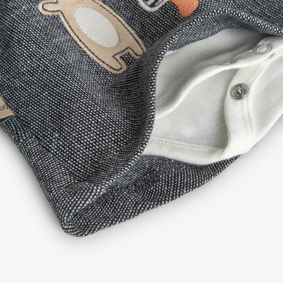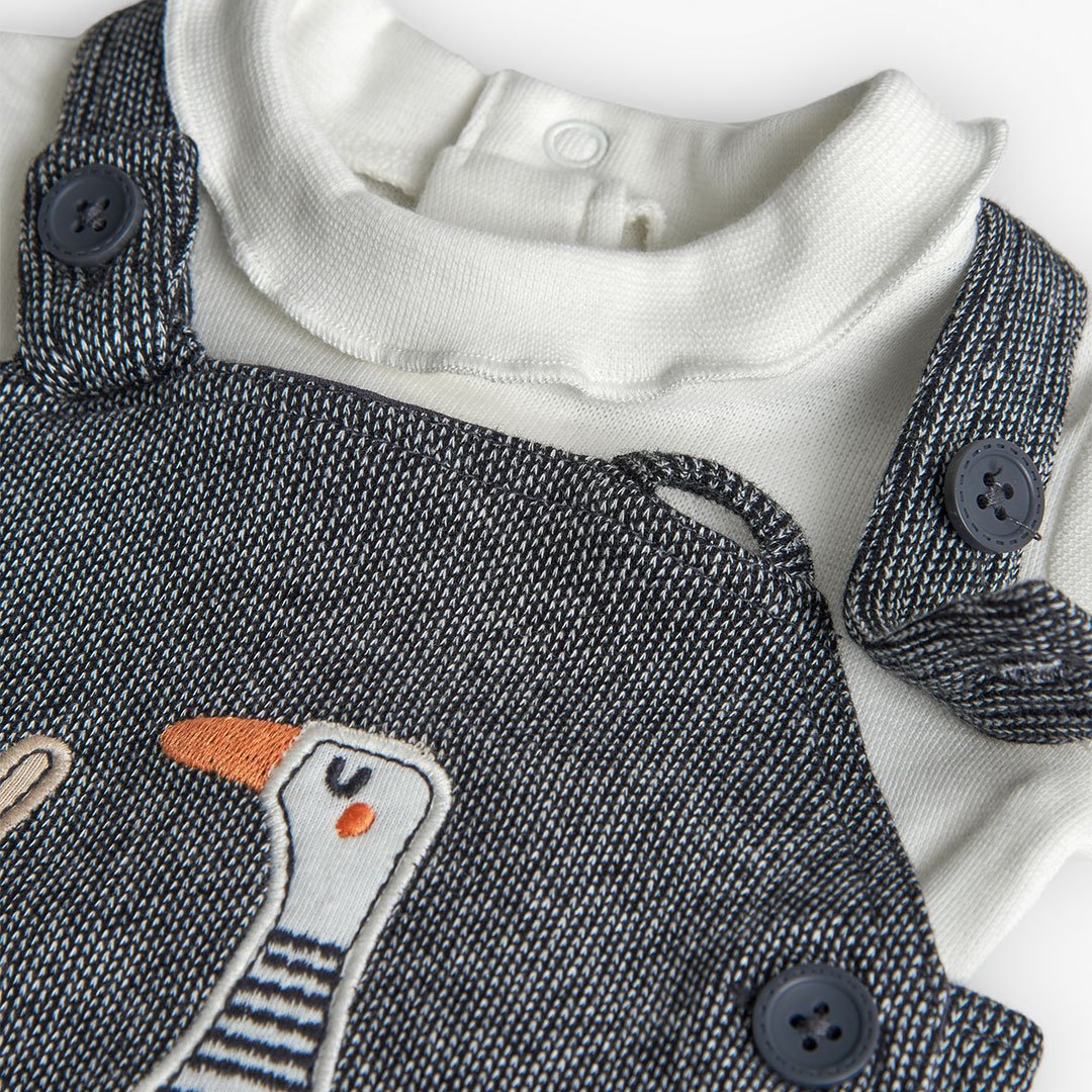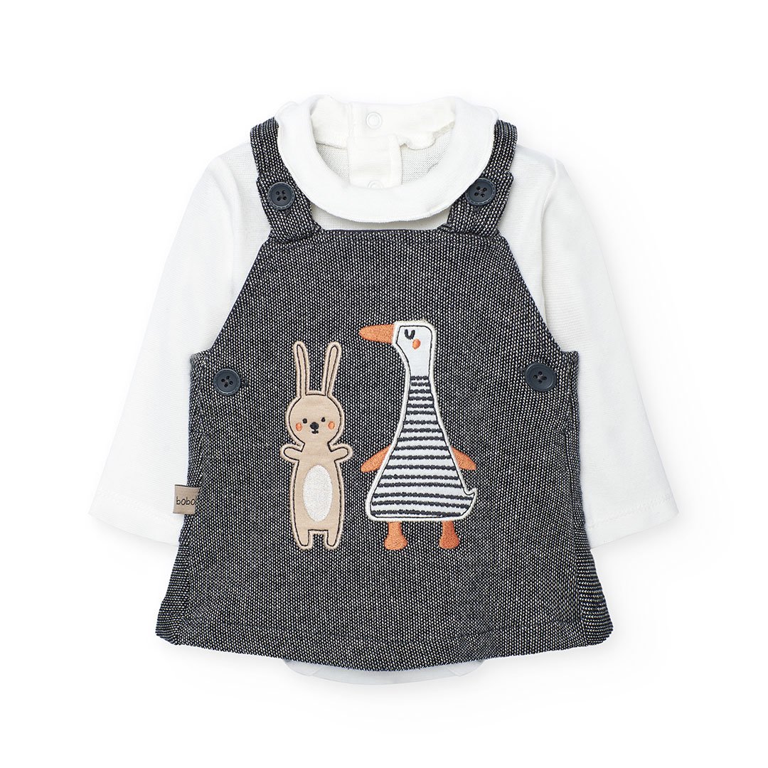 Ένα κομψό και πρακτικό βρεφικό σετ που συνδυάζει άνεση με παιχνιδιάρικη διάθεση. Το σετ περιλαμβάνει λευκό βαμβακερό κορμάκι με μακρύ μανίκι και κουμπάκια για εύκολο ντύσιμο, καθώς και γκρι φόρεμα–σαλοπέτα με κεντημένα ζωάκια στο μπροστινό μέρος. Μαλακό στην υφή και ευκολοφόρετο, αποτελεί ιδανική επιλογή για καθημερινές εμφανίσεις αλλά και για ξεχωριστές περιστάσεις.