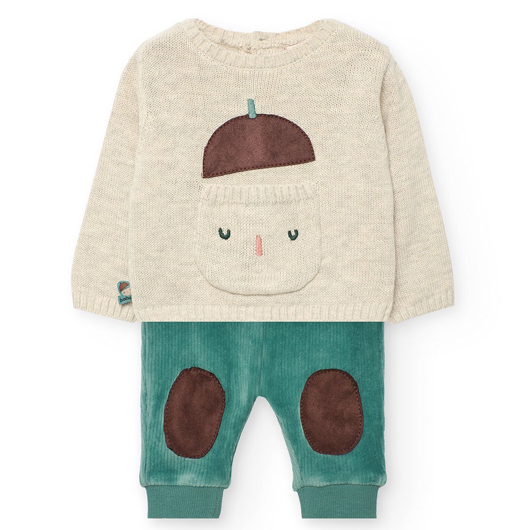 Ένα υπέροχο βρεφικό σετ της Boboli που συνδυάζει στυλ, απαλότητα και ζεστασιά. Η πλεκτή μπλούζα σε φυσική απόχρωση με κεντημένο μοτίβο βελανίδι χαρίζει μια ζεστή, χειμερινή πινελιά, ενώ το πράσινο κοτλέ παντελόνι με ενισχυμένα γόνατα προσφέρει άνεση και πρακτικότητα. Ιδανικό για δώρο χάρη στη μαλακή υφή του και το χαριτωμένο design του, αποτελεί μια γλυκιά επιλογή για τις πρώτες του εμφανίσεις.