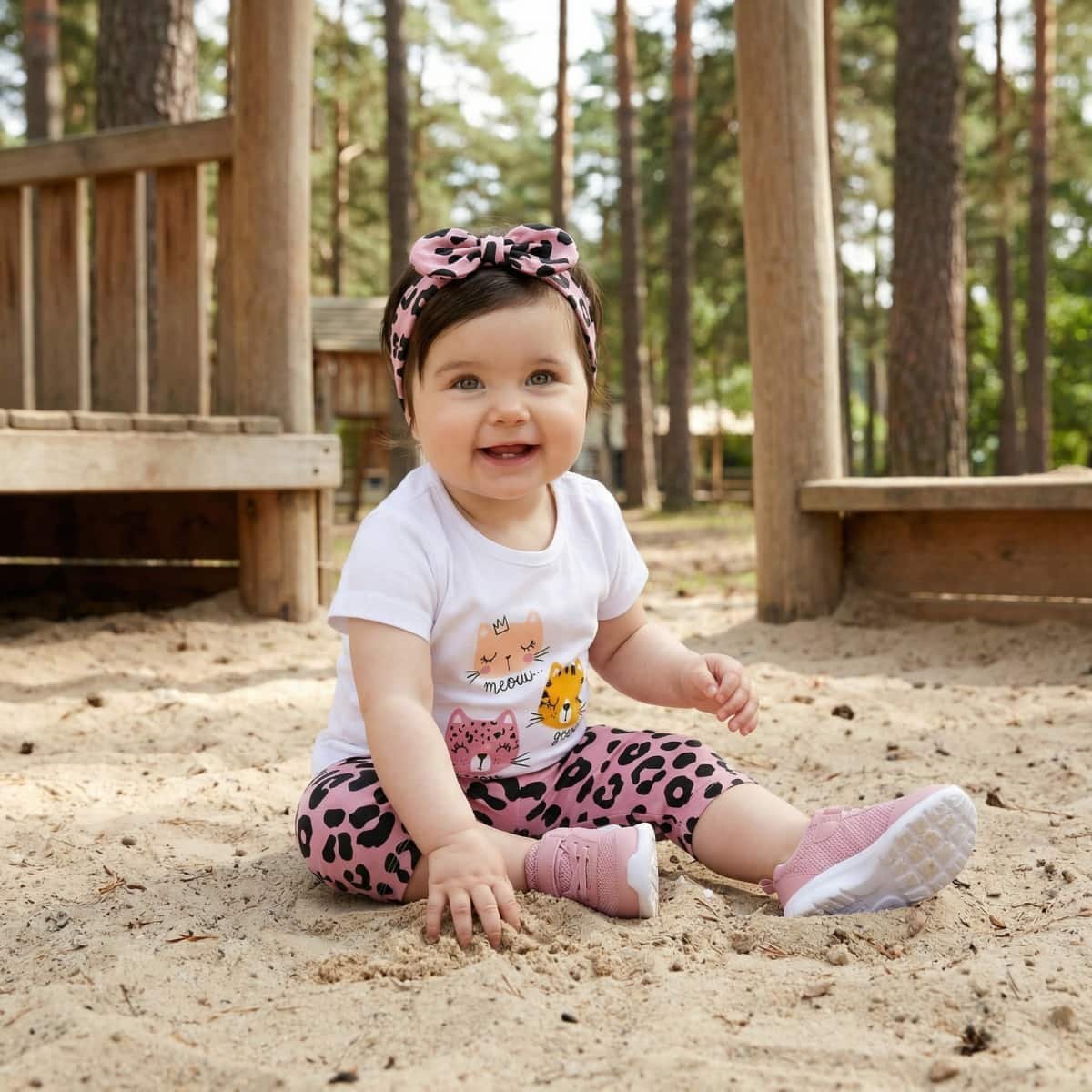 Ροζ βρεφικό σετ για κορίτσι με μπλούζα με γατούλες, leopard κολάν και ασορτί κορδέλα για γλυκό καθημερινό ντύσιμο.
