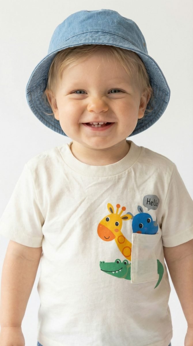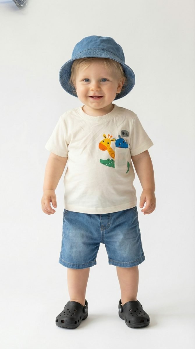 Εκρού σετ ζωάκια με κοντομάνικη μπλούζα, τζιν βερμούδα και καπέλο από 100% βαμβάκι, ιδανικό για άνετες και δροσερές καλοκαιρινές εμφανίσεις.