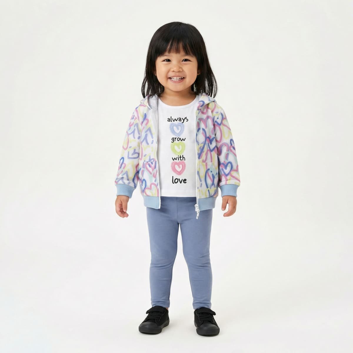 Σετ 3 τεμαχίων με λευκή μπλούζα, ζακέτα με καρδιές και σιέλ κολάν. Άνετη και χαριτωμένη επιλογή για καθημερινό ντύσιμο.