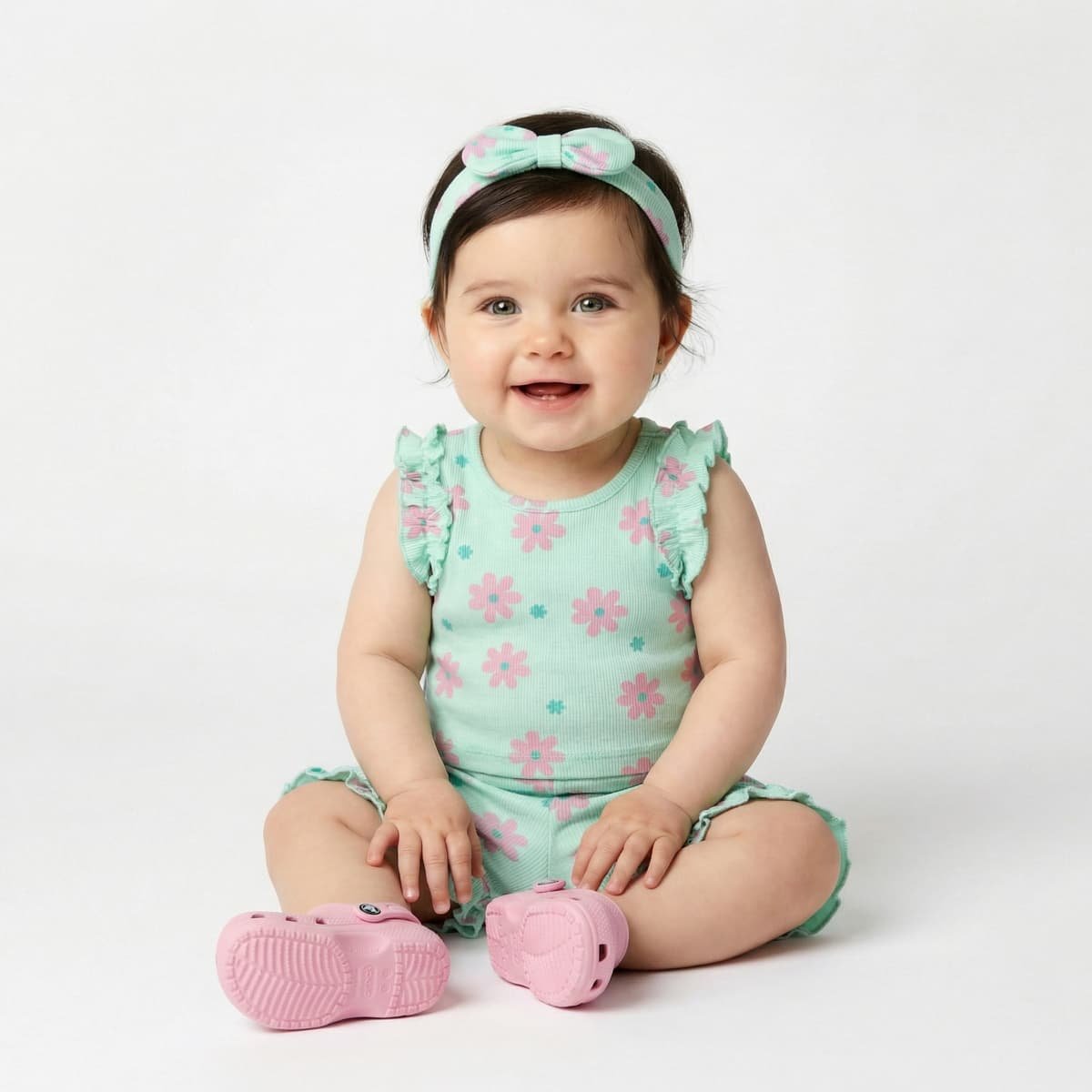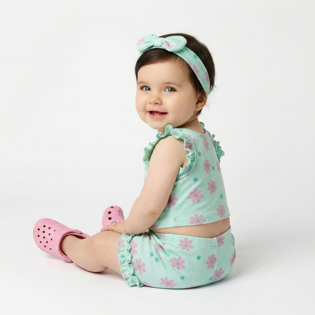 Το μέντα λουλουδάτο σετ συνδυάζει απαλό χρώμα, καλοκαιρινή διάθεση και άνεση για βόλτα, παιχνίδι και ξεχωριστές στιγμές.