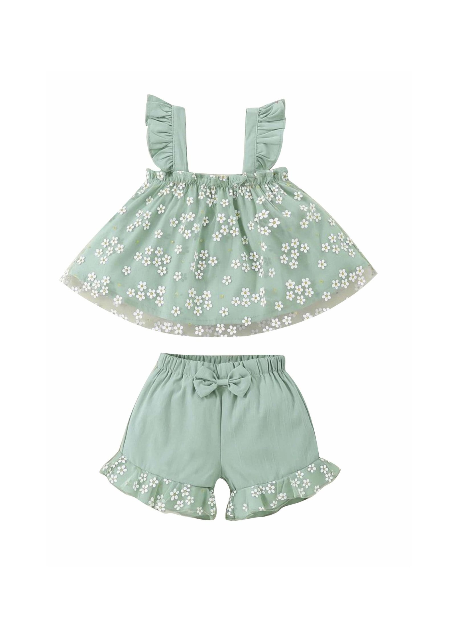 Καλοκαιρινό μέντα σύνολο με λουλουδάτο τοπ και σορτς με βολάν. Γλυκιά και δροσερή επιλογή για κάθε μέρα ή πιο ιδιαίτερες στιγμές.