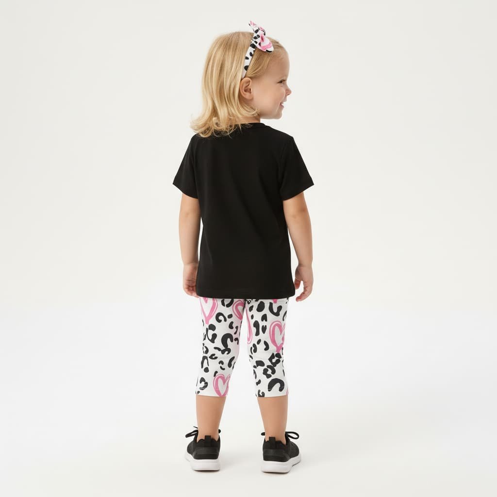 Αποτελείται από μαύρη κοντομάνικη μπλούζα και λευκό κάπρι κολάν με ροζ καρδιές και animal print λεπτομέρειες.