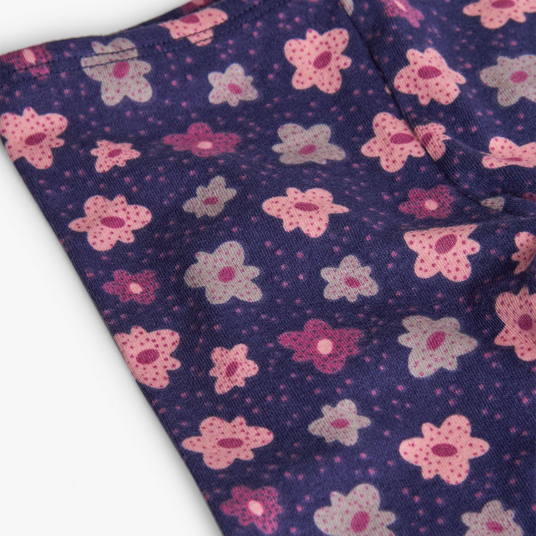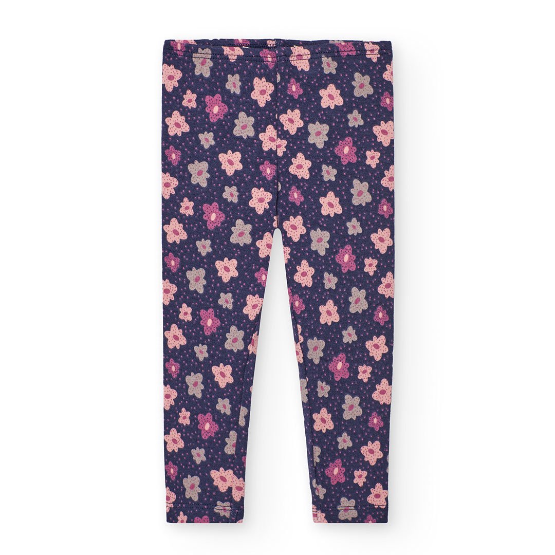 Μαλακό παιδικό κολάν Boboli σε μωβ χρώμα με ροζ λουλούδια. Από 95% βαμβάκι και 5% ελαστάνη, ιδανικό για άνεση και στυλ κάθε μέρα.
