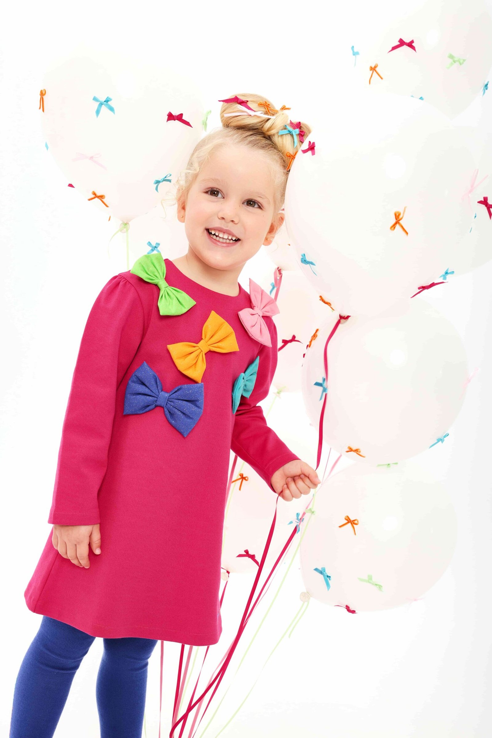 Λαμπερό παιδικό φόρεμα σε φούξια με πολύχρωμους φιόγκους και μπλε καλσόν. Μια χαρούμενη επιλογή για κορίτσια που αγαπούν το στυλ.