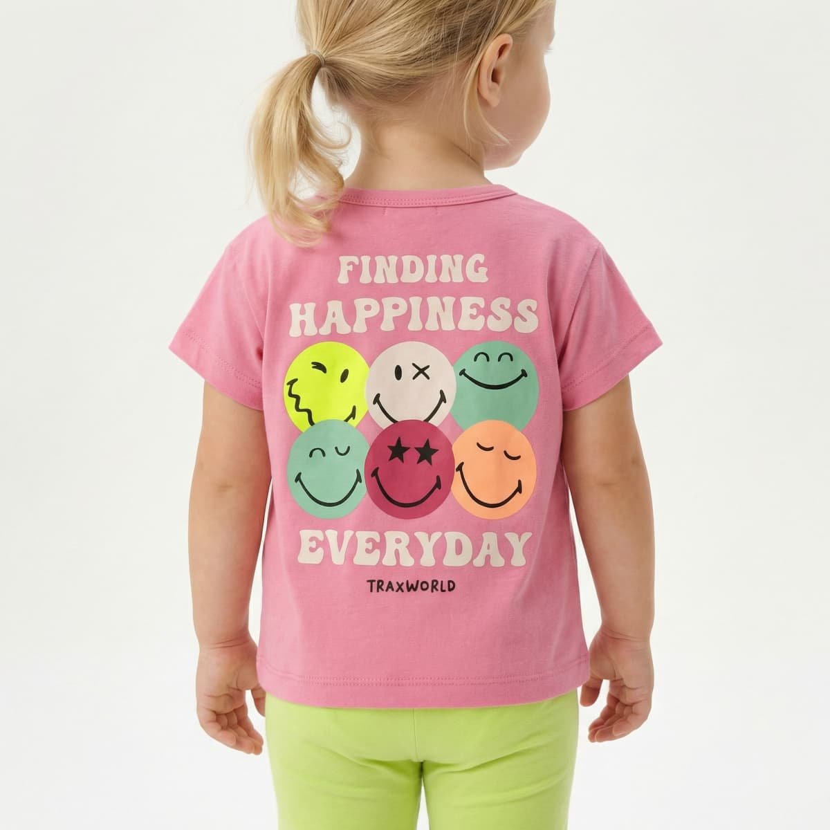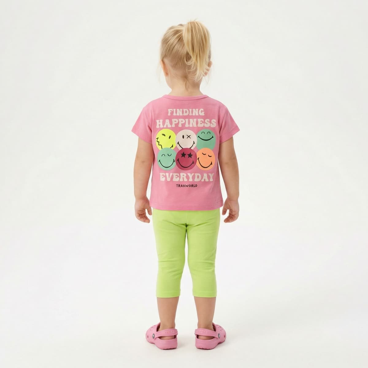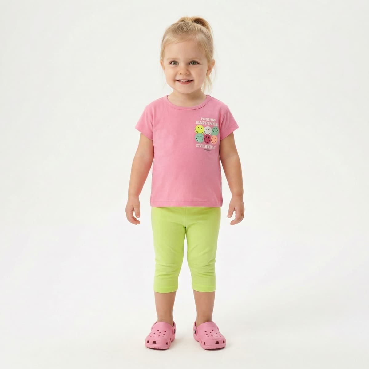 Καλοκαιρινό ροζ σετ με smile μπλούζα και λαχανί κάπρι κολάν. Άνετη και παιχνιδιάρικη επιλογή για καθημερινό ντύσιμο.