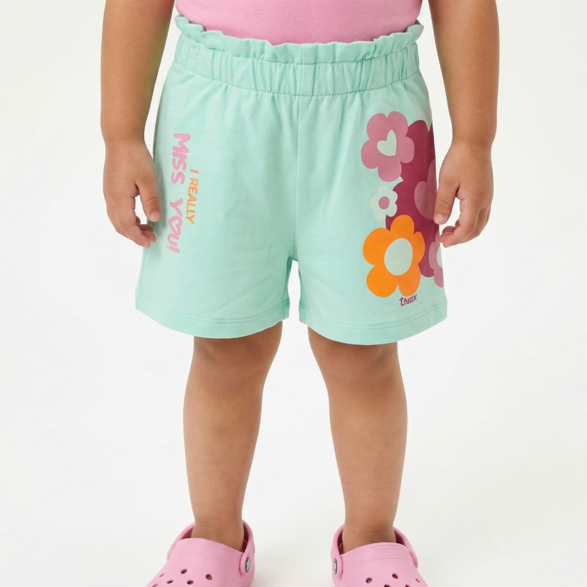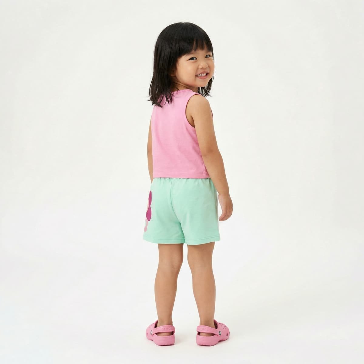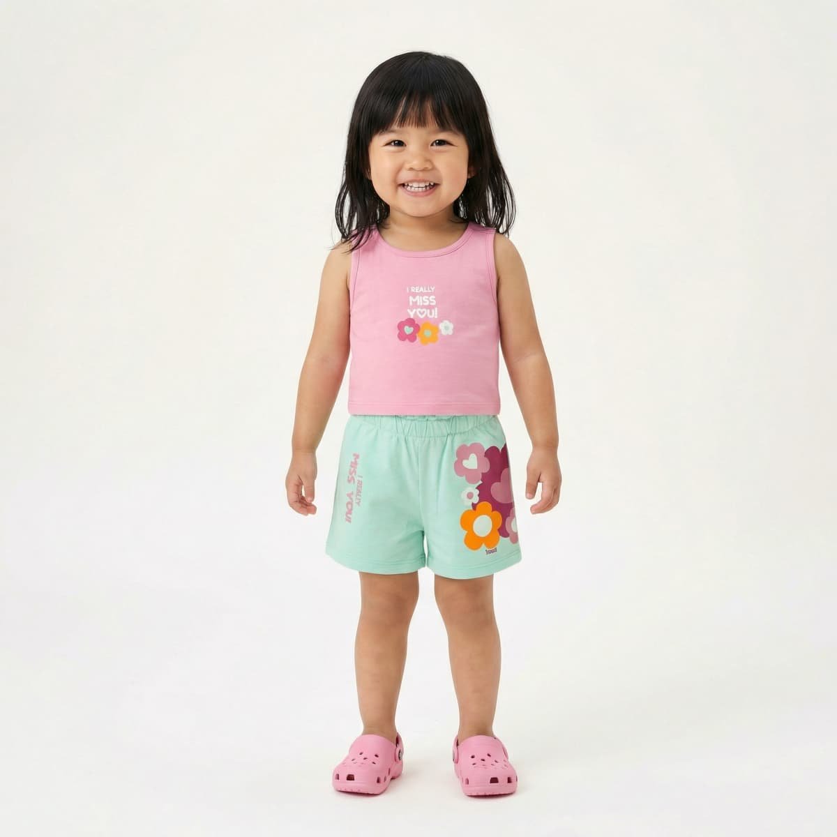Καλοκαιρινό σύνολο με ροζ αμάνικο τοπ και μέντα σορτς με λουλούδια. Άνετη και γλυκιά επιλογή για κάθε μέρα.