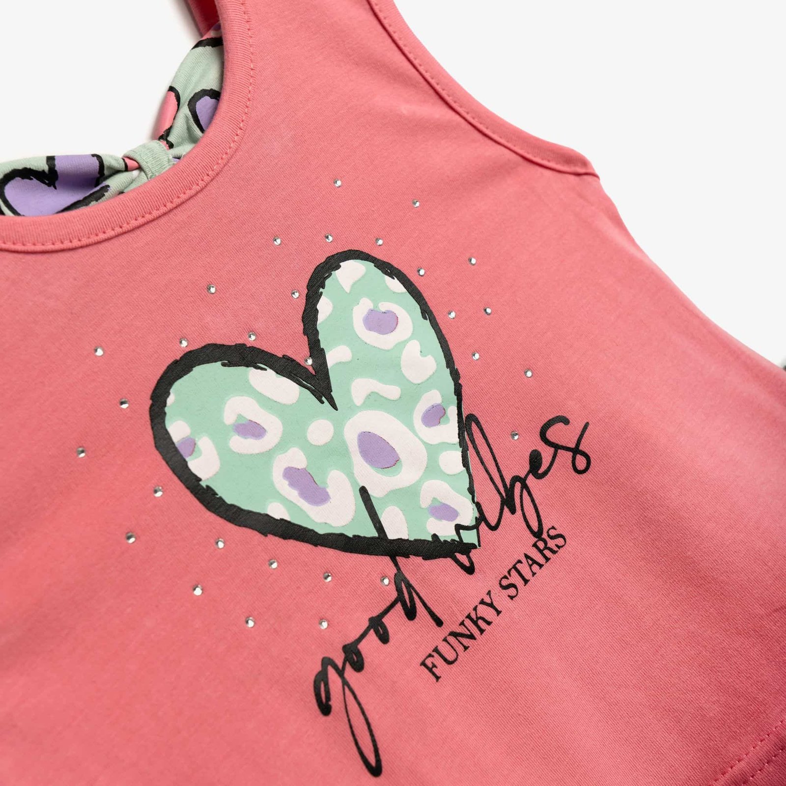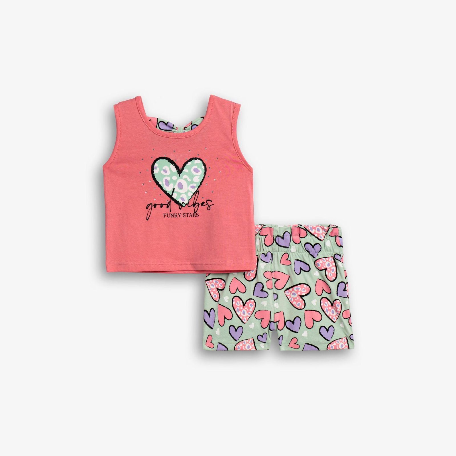 Σετ “Good Vibes” με σομόν αμάνικο μπλουζάκι και μέντα σορτς με καρδιές. Άνετο βαμβακερό ύφασμα με ελαστάν για καλοκαιρινές εμφανίσεις.