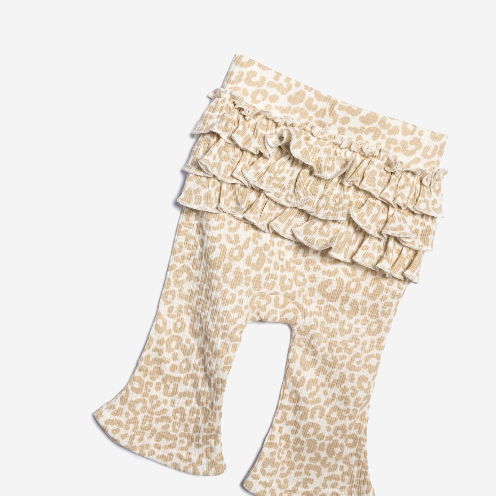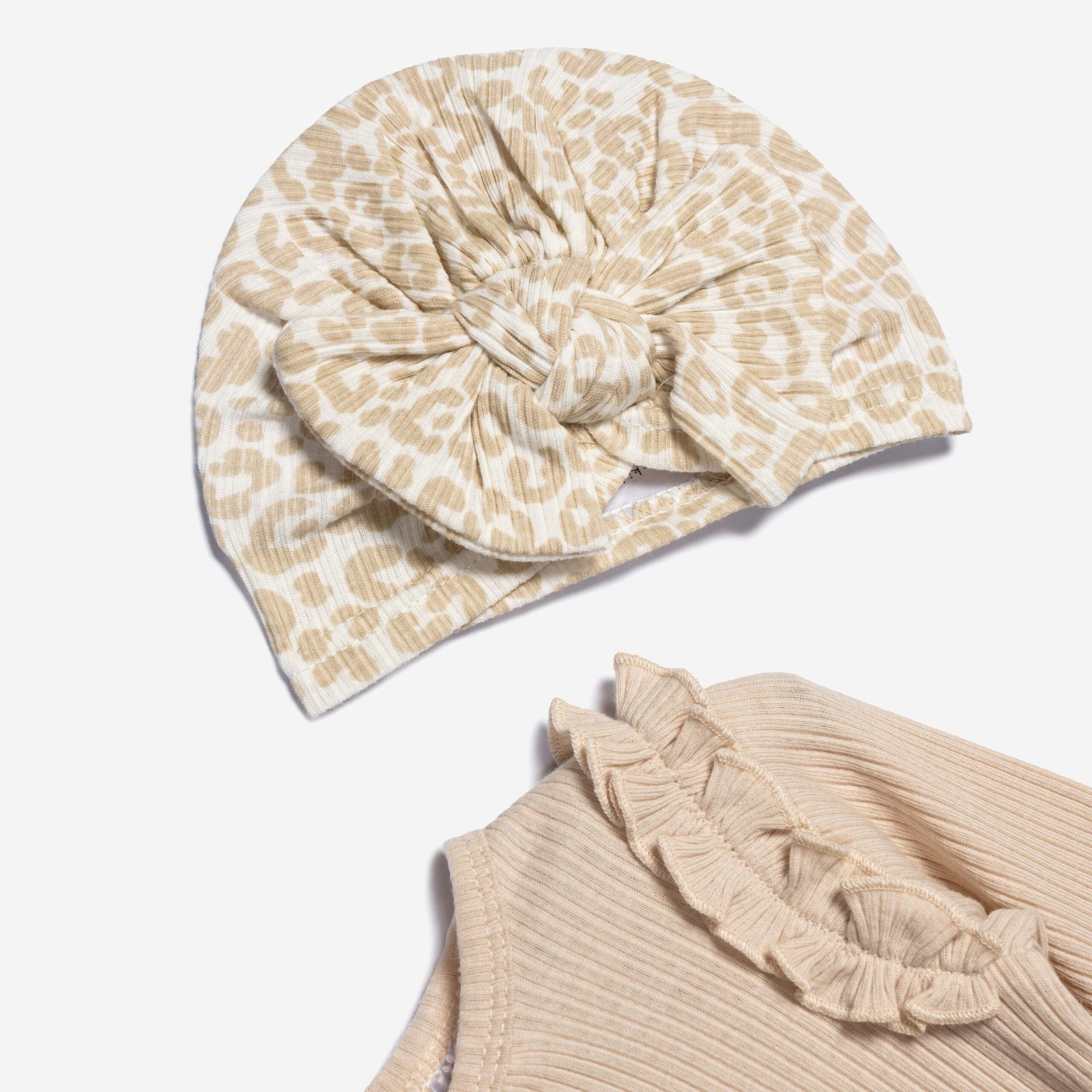 Περιλαμβάνει ριπ κορμάκι σε γήινη μπεζ απόχρωση με βολάν στους ώμους, παντελόνα με λεοπάρ μοτίβο και κορδέλα στο ίδιο σχέδιο.