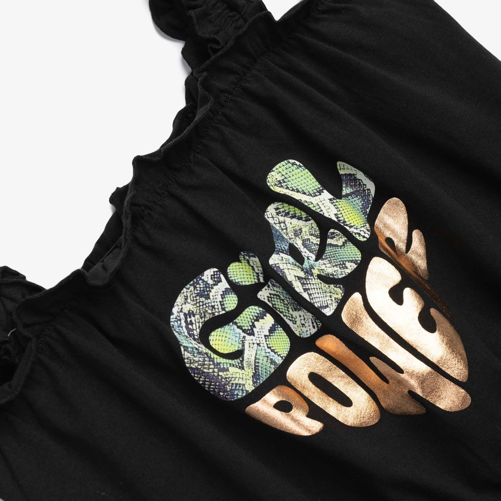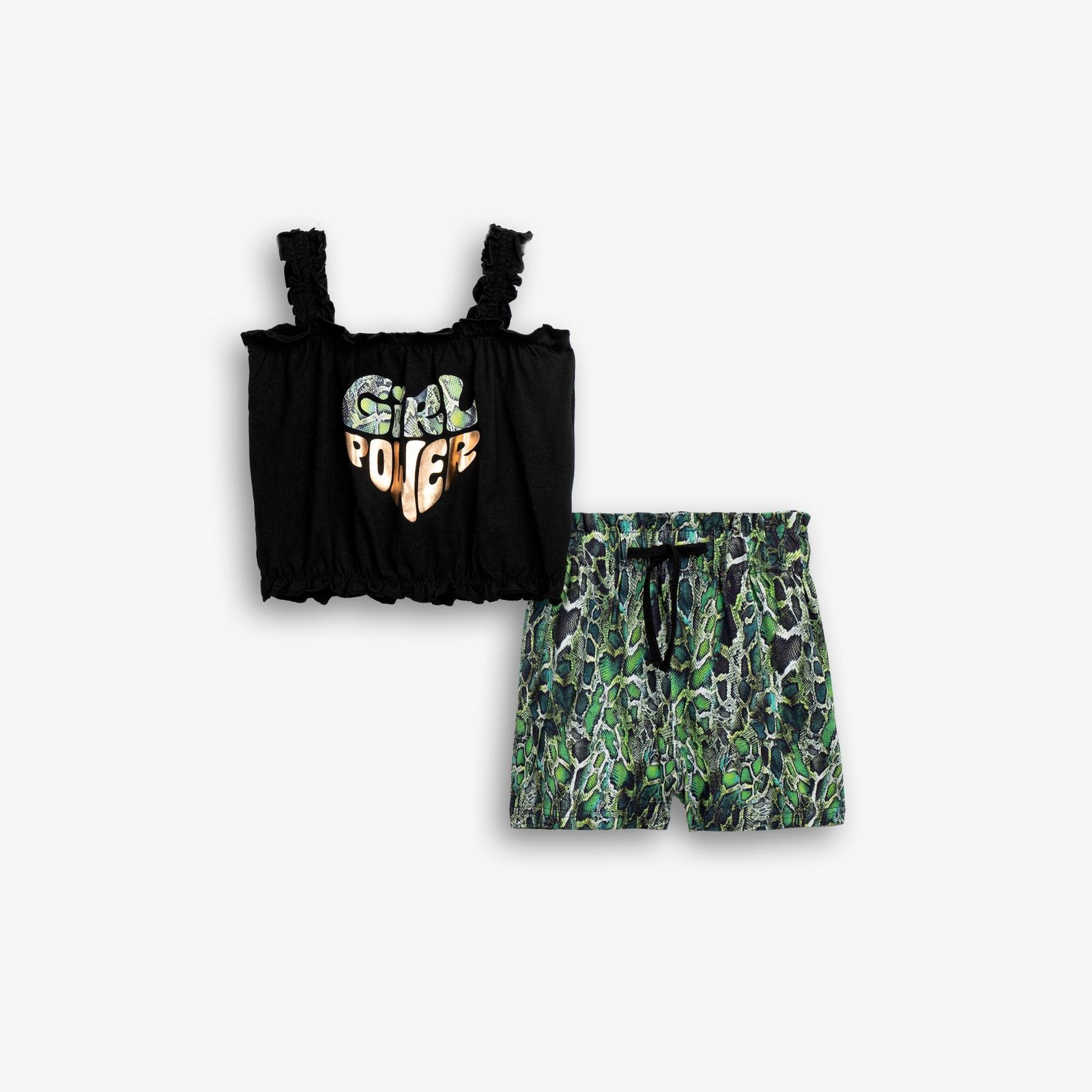 Μαύρο σετ Funky για κορίτσι με τοπ Girl Power, βολάν τιράντες και snake print σορτς για ξεχωριστό καλοκαιρινό στιλ.