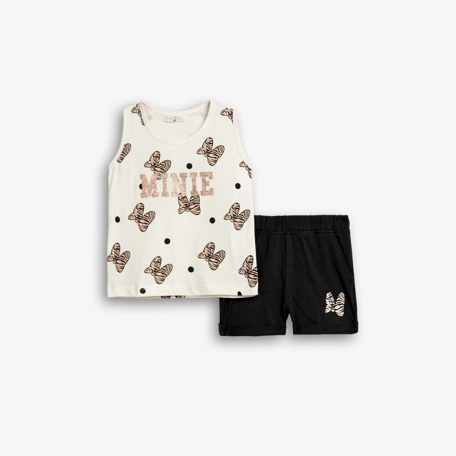 Σετ “Minnie” με εκρού αμάνικο μπλουζάκι με πεταλούδες και μαύρο σορτς με ρεβέρ. Μαλακό βαμβακερό ύφασμα με ελαστάν για άνεση.