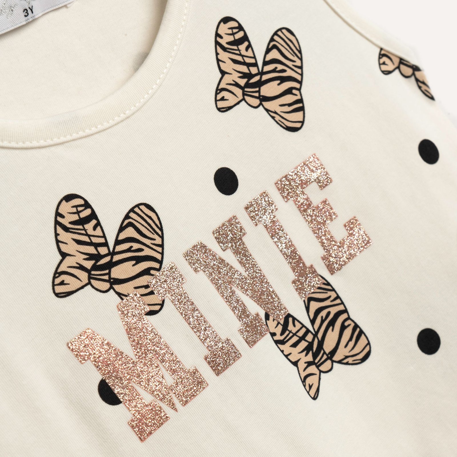Περιλαμβάνει εκρού αμάνικο μπλουζάκι με all over πεταλούδες και λαμπερό print “MINNIE”.