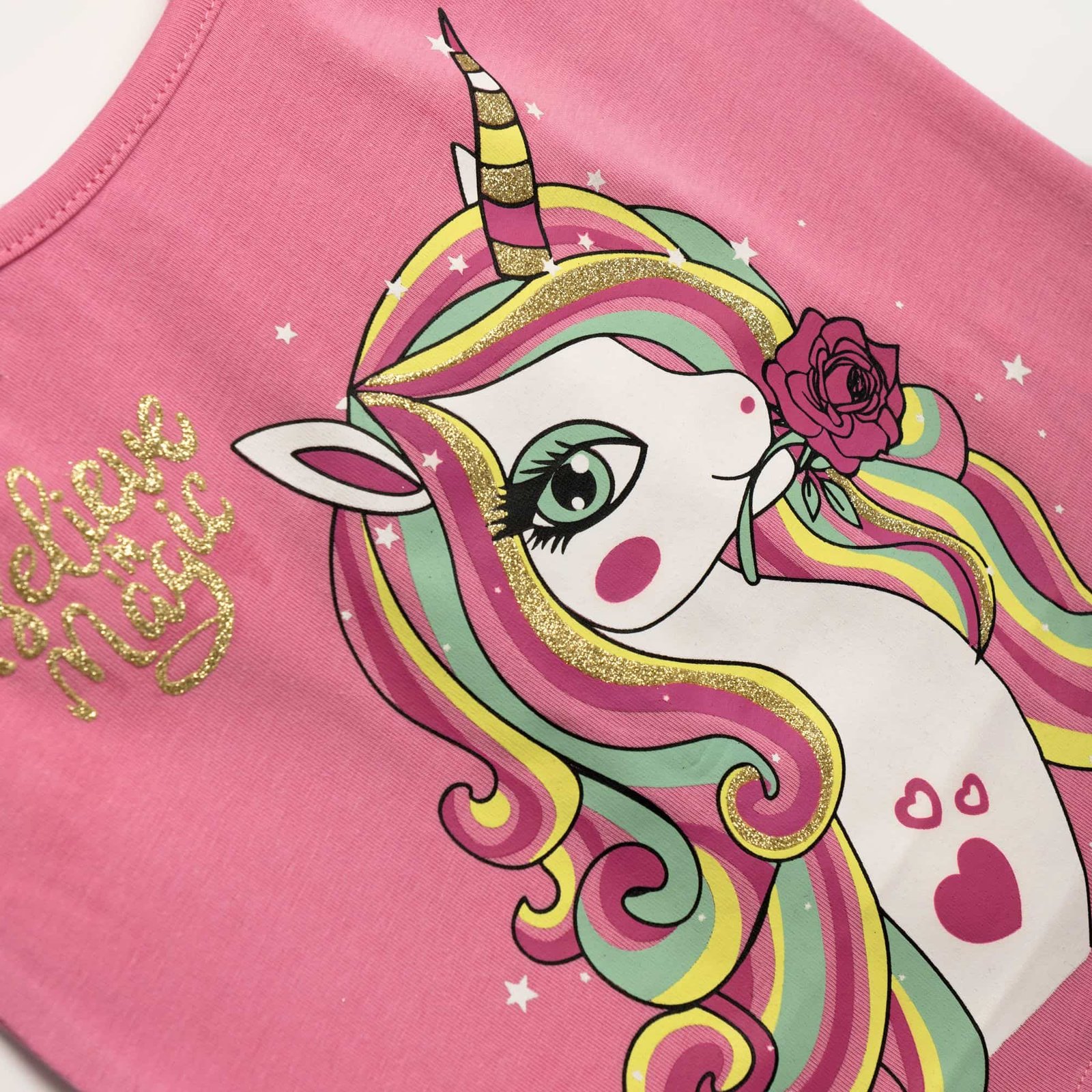 Funky σετ μονόκερος κορίτσι “Believe Magic” με ροζ αμάνικο μπλουζάκι και σορτς μέντα. Απαλό, ελαστικό, ιδανικό για το καλοκαίρι.