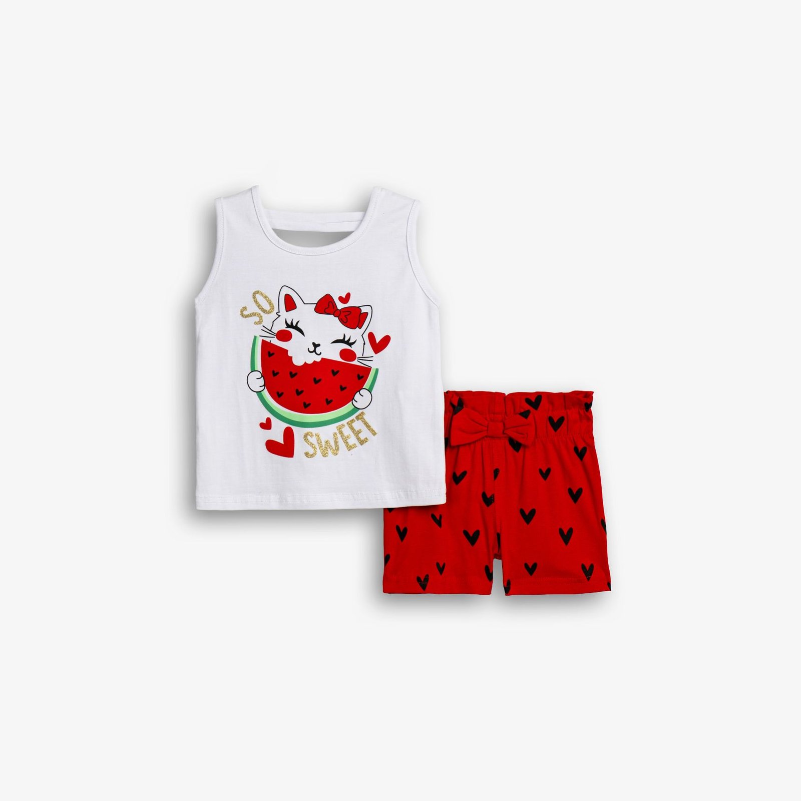 Καλοκαιρινό σετ με λευκή αμάνικη μπλούζα “So Sweet” και κόκκινο σορτς με καρδιές και φιόγκο. Μαλακό βαμβάκι με ελαστάν.