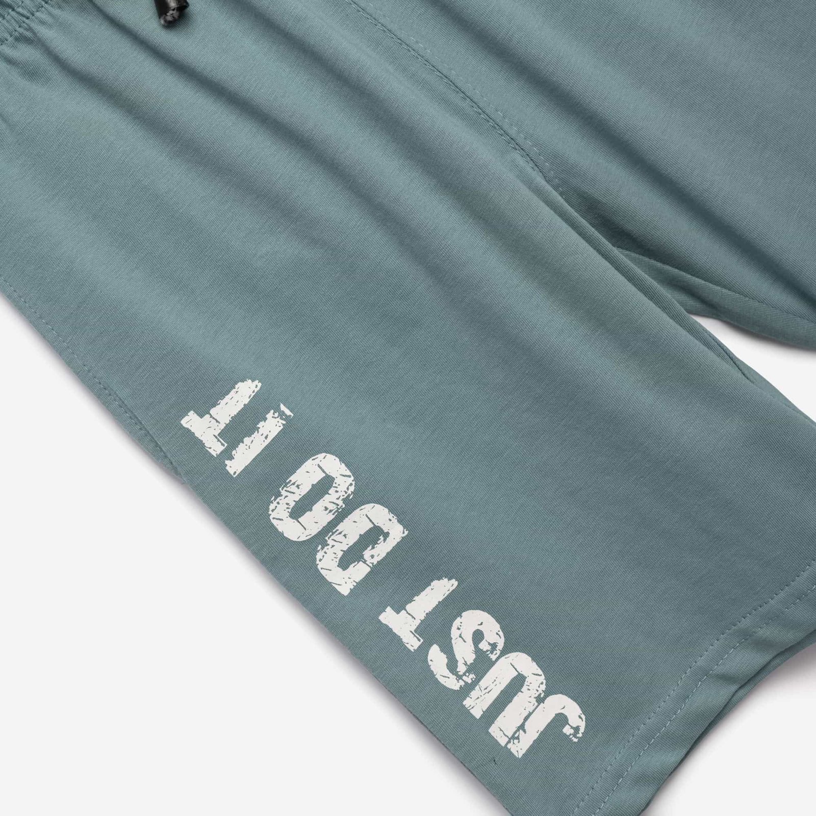 Σετ με μαύρο t-shirt “Just” και σιέλ βερμούδα με κορδόνι. 100% βαμβάκι για δροσερή, καθημερινή χρήση.