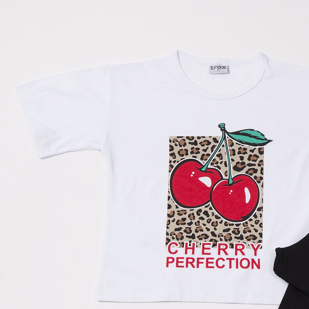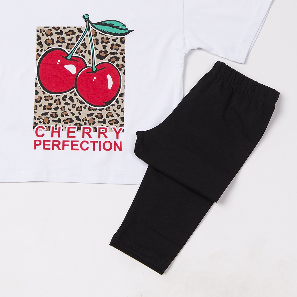 Σετ Μπλούζα & Κολάν Κάπρι Κορίτσι “Cherry Perfection” – Λευκό/Μαύρο