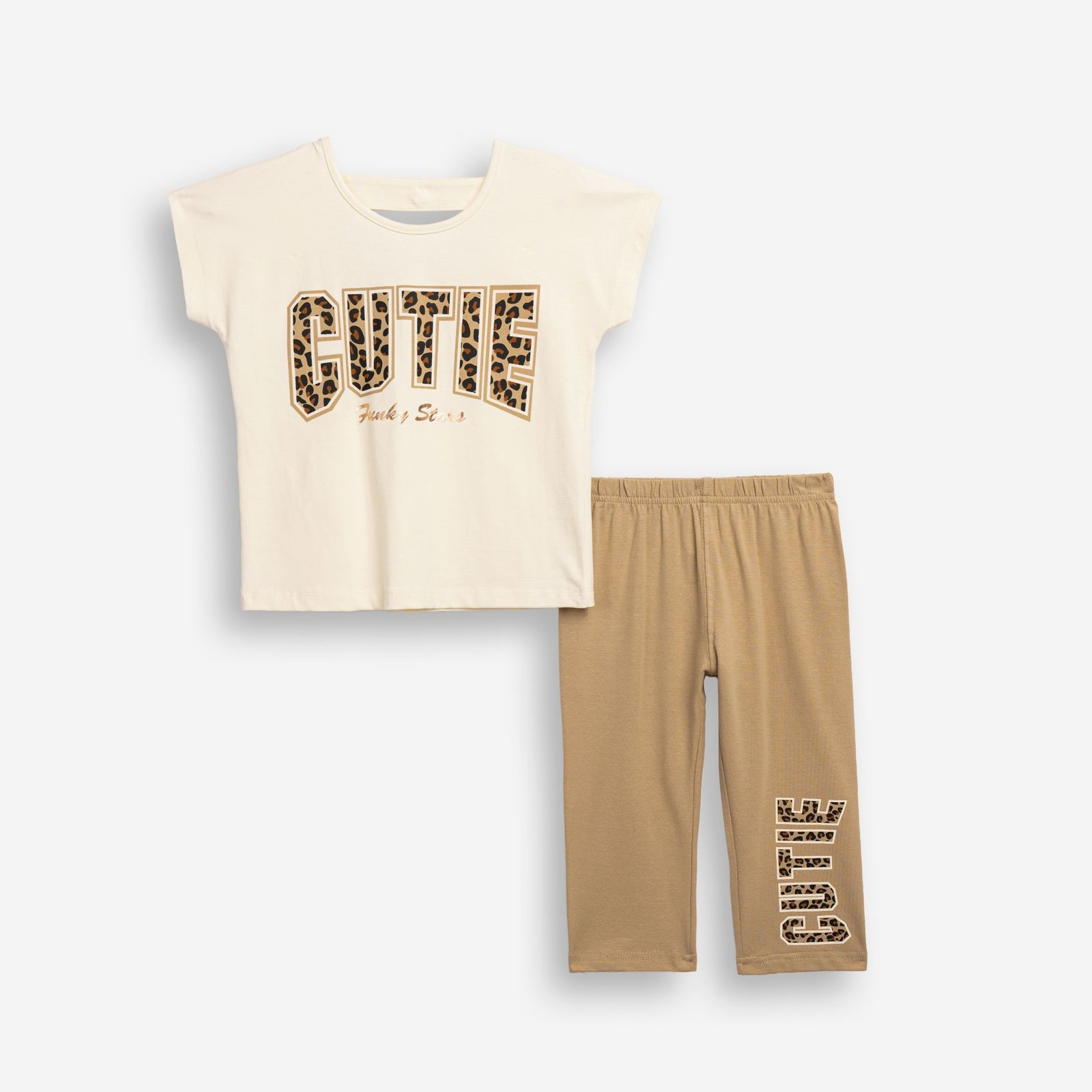 Σετ με εκρού μπλούζα “CUTIE” leopard print και μπεζ κολάν κάπρι με στάμπα στο πόδι. Άνετο βαμβάκι με ελαστάν.