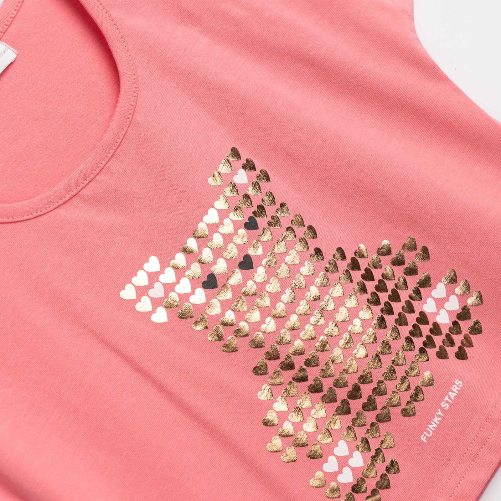 Η ροζ κοντομάνικη μπλούζα ξεχωρίζει με σχέδιο αρκουδάκι από μικρές καρδιές και λαμπερές λεπτομέρειες.