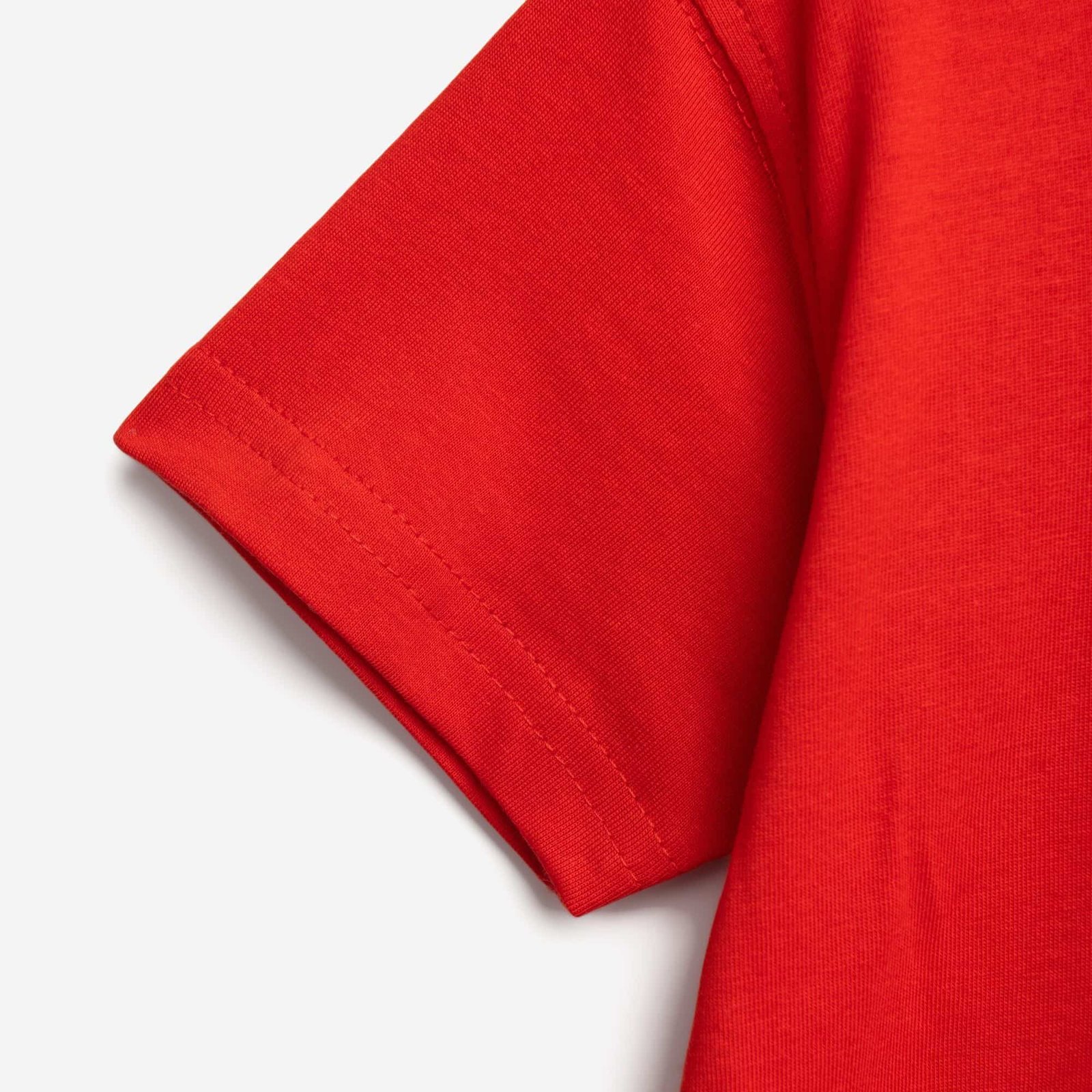 Η κόκκινη κοντομάνικη μπλούζα τραβάει τα βλέμματα με το χαριτωμένο σχέδιο αρκουδάκι σε sporty look.