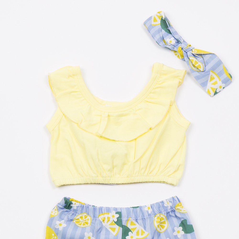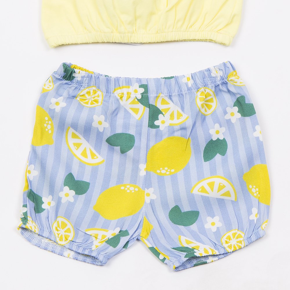 TRAX σετ λεμόνια κορίτσι με τοπ βαμβακερό και σορτσάκι βισκόζη. Δροσερό, ανάλαφρο και ιδανικό για καλοκαιρινές βόλτες και διακοπές.