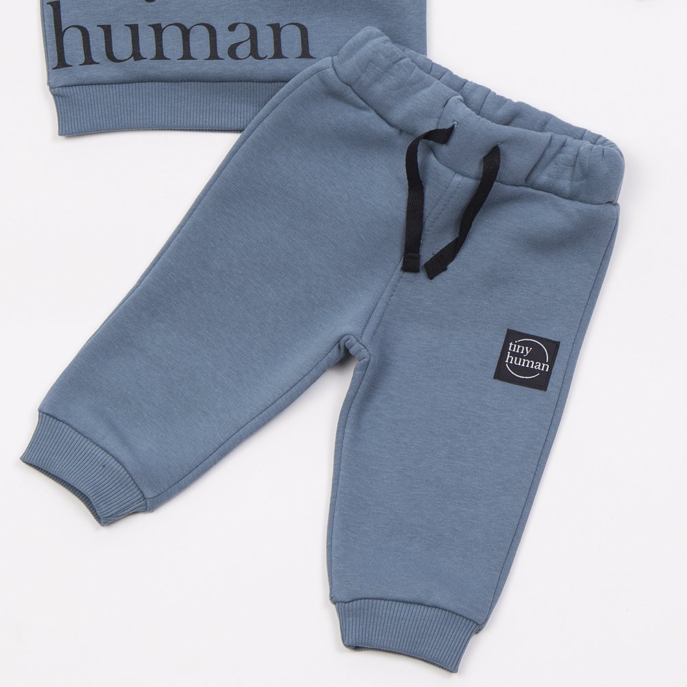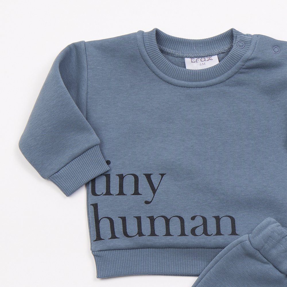 Αποτελείται από μπλε φούτερ με minimal τύπωμα tiny human και παντελόνι στην ίδια απόχρωση με μαύρα κορδόνια και λάστιχο στη μέση.