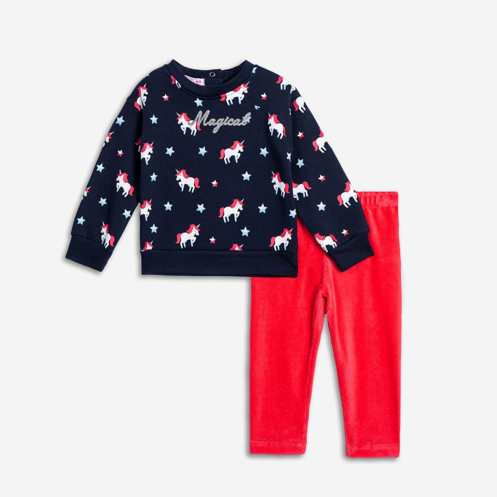 Σετ Funky “Magical Unicorn” για κορίτσι. Μπλε φούτερ με μονόκερους και κόκκινο βελούδινο παντελόνι. Ζεστό, μαλακό και ονειρεμένο outfit.