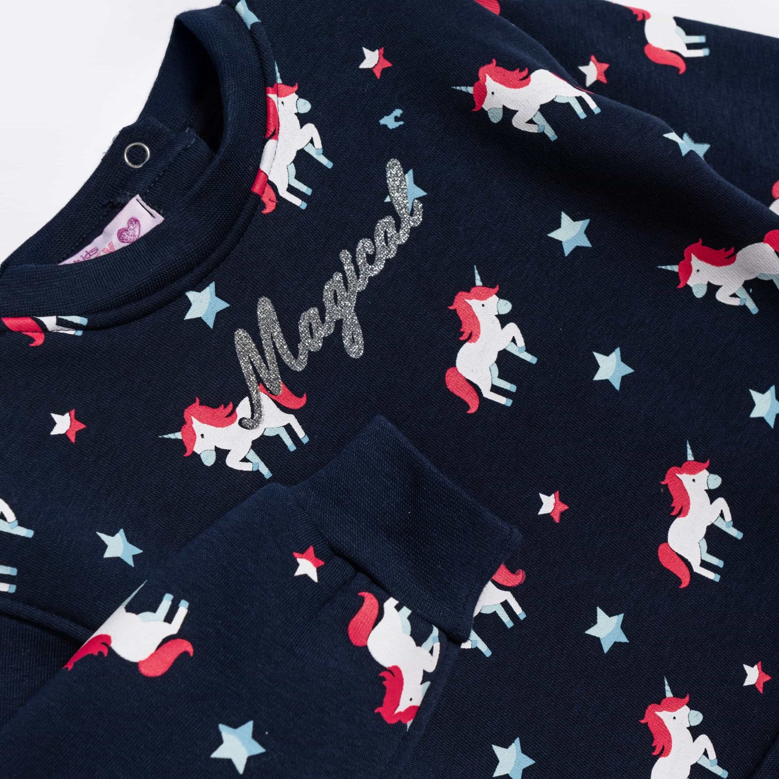 Το μπλε φούτερ είναι γεμάτο μονόκερους και αστεράκια, με γκλίτερ λεπτομέρεια “Magical”.