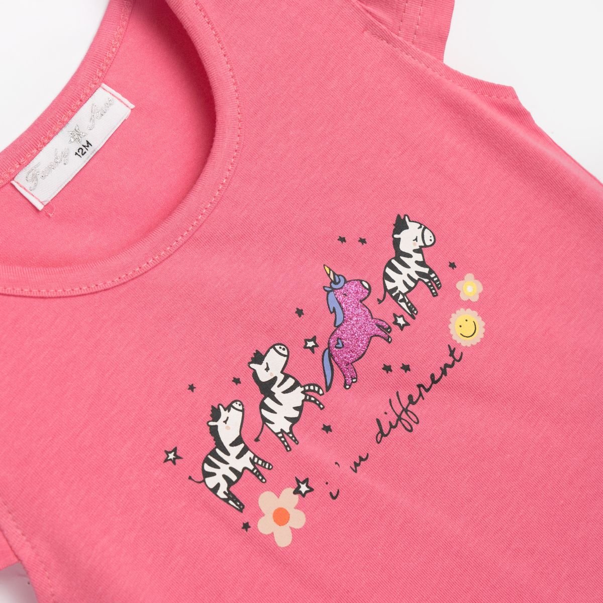 Η ροζ μπλούζα ξεχωρίζει με χαριτωμένο σχέδιο με ζέβρες, μονόκερο και παιχνιδιάρικες λεπτομέρειες.