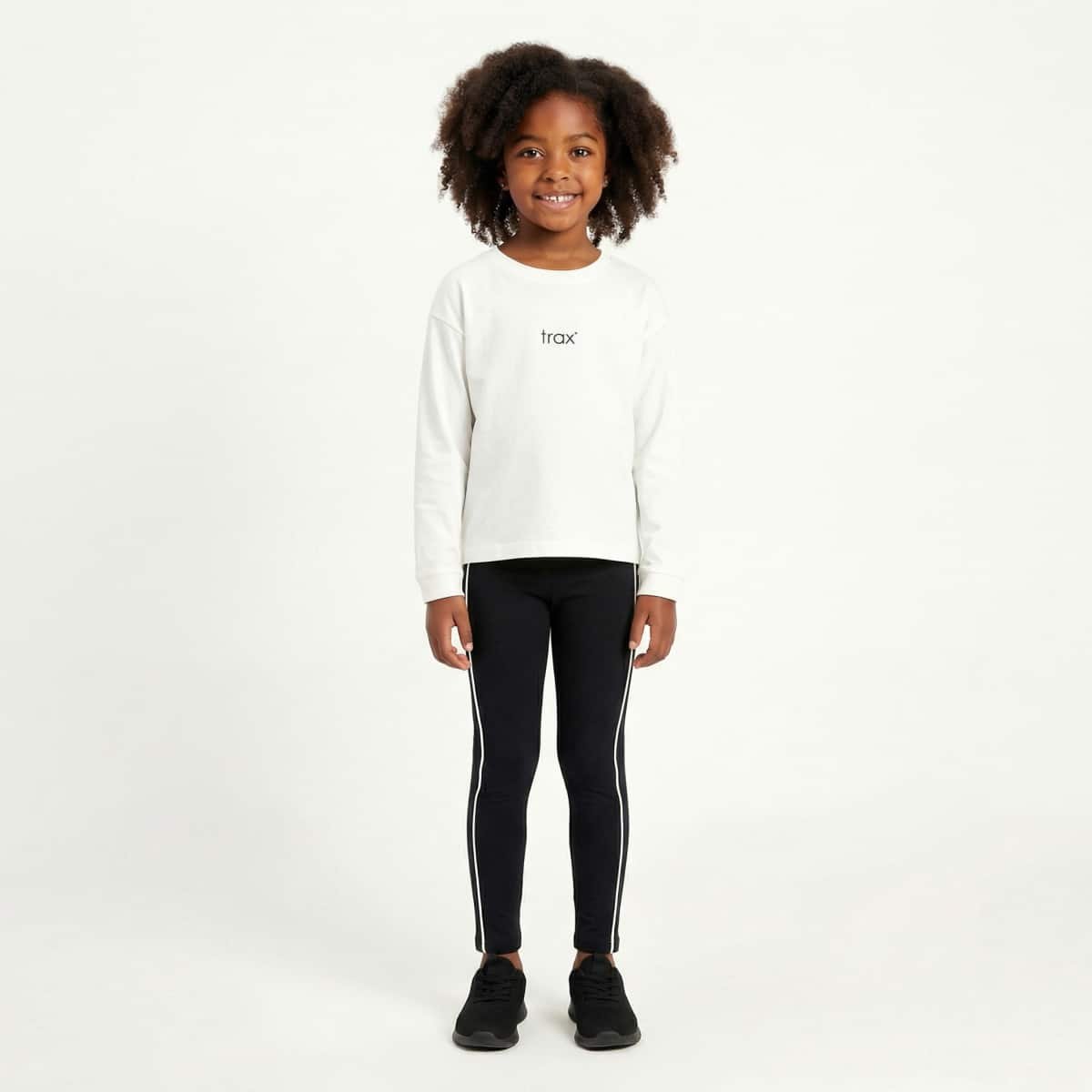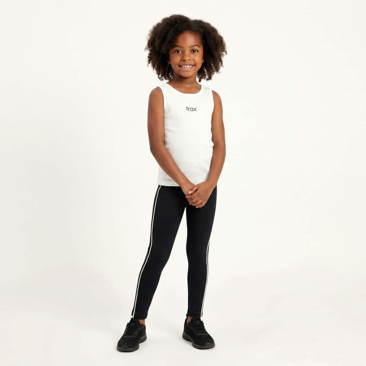 Λευκό σετ 3 τεμαχίων για κορίτσι με μακρυμάνικη μπλούζα, αμάνικο τοπ και μαύρο κολάν σε άνετη καθημερινή γραμμή.