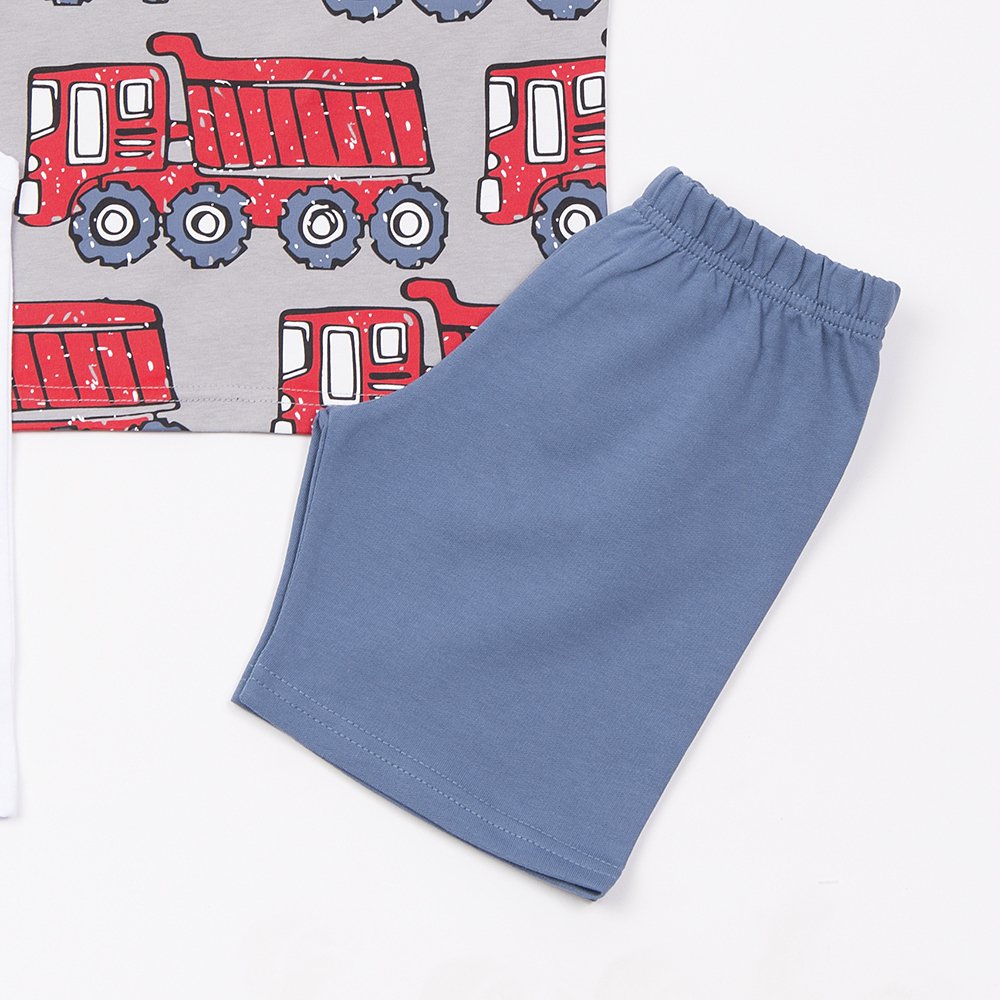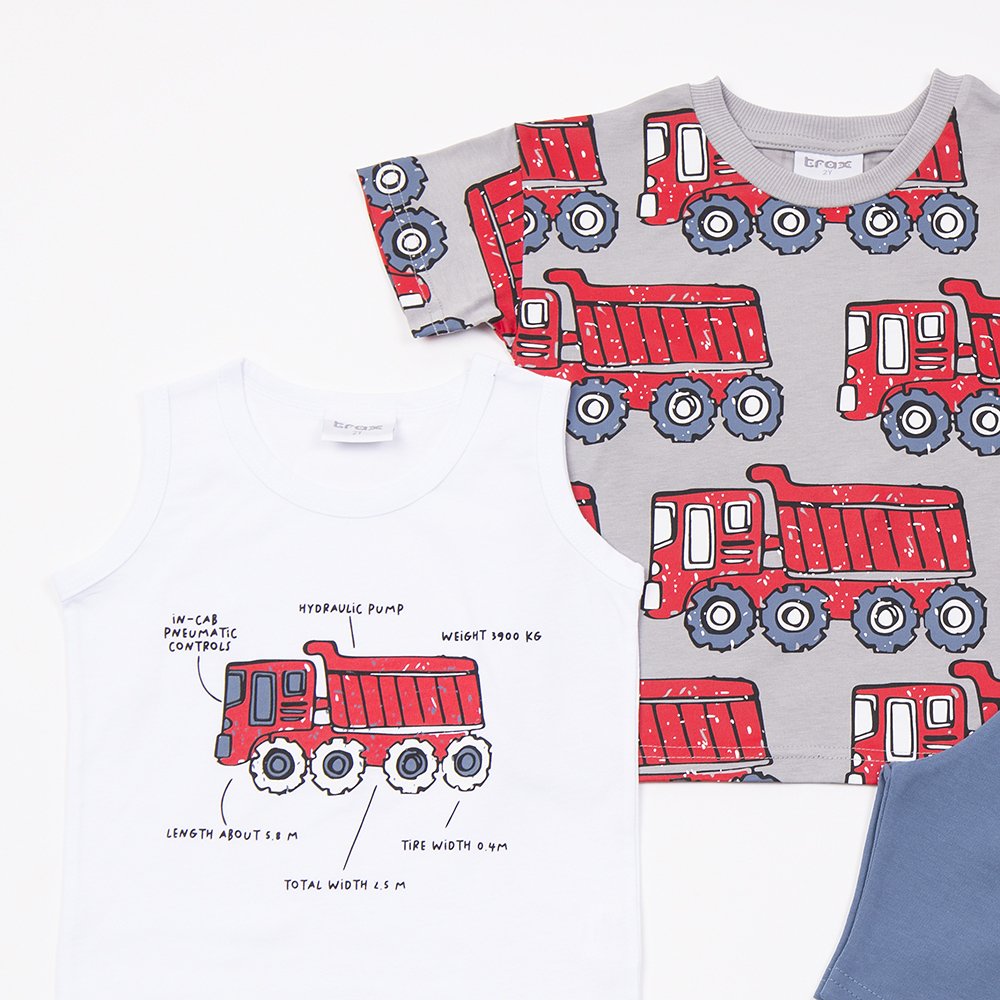 Τριπλέτα αγόρι “Truck” από 100% βαμβάκι με δύο μπλούζες και σορτσάκι. Άνετη και ιδανική για το καλοκαίρι.