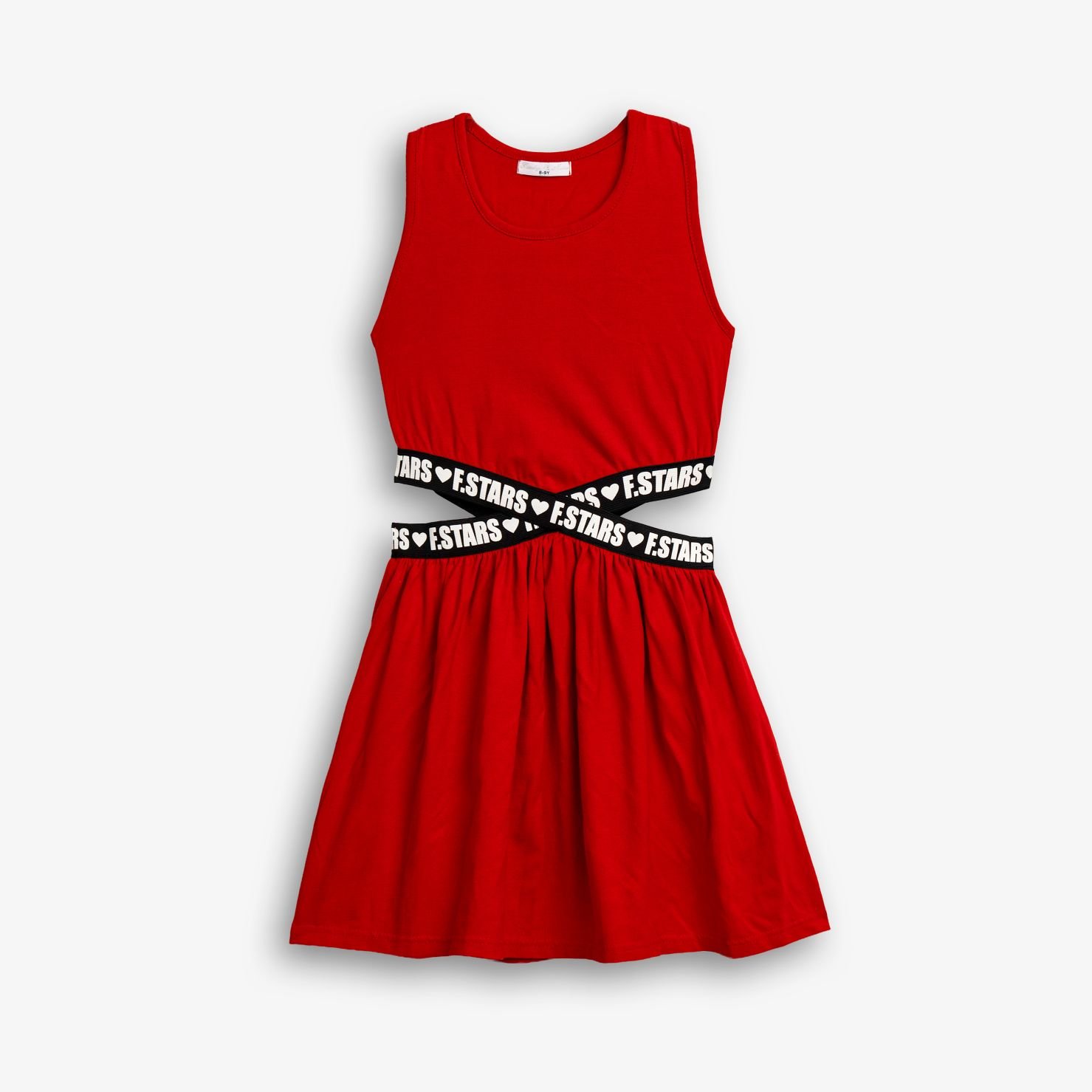 Αμάνικο κόκκινο φόρεμα με χιαστί ελαστική ταινία “F.STARS” στη μέση και αέρινη φούστα. Άνετο βαμβάκι με ελαστάν.