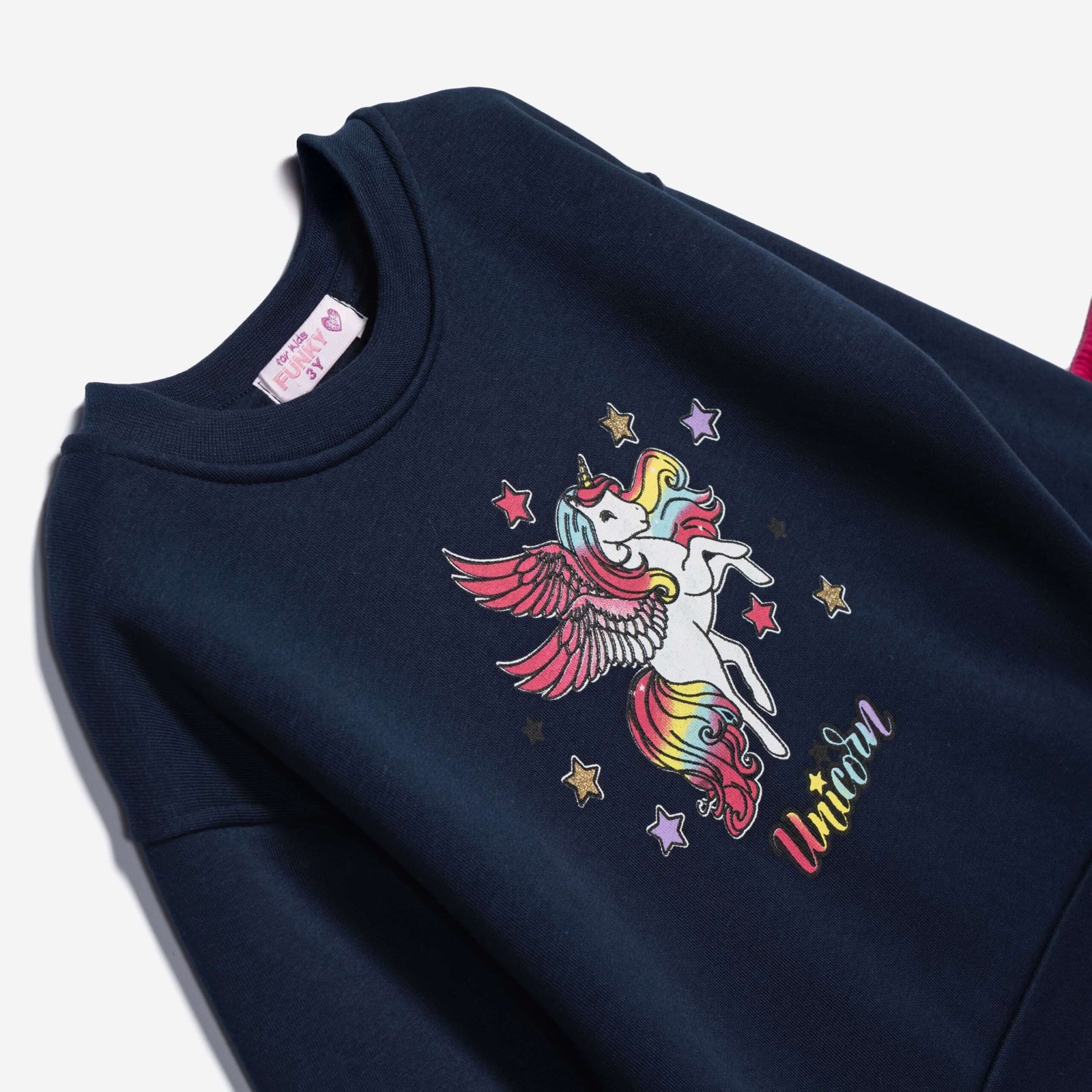 Περιλαμβάνει μπλε φούτερ με στάμπα μονόκερο και φούξια παντελόνι για ένα χαρούμενο, ζωηρό look.